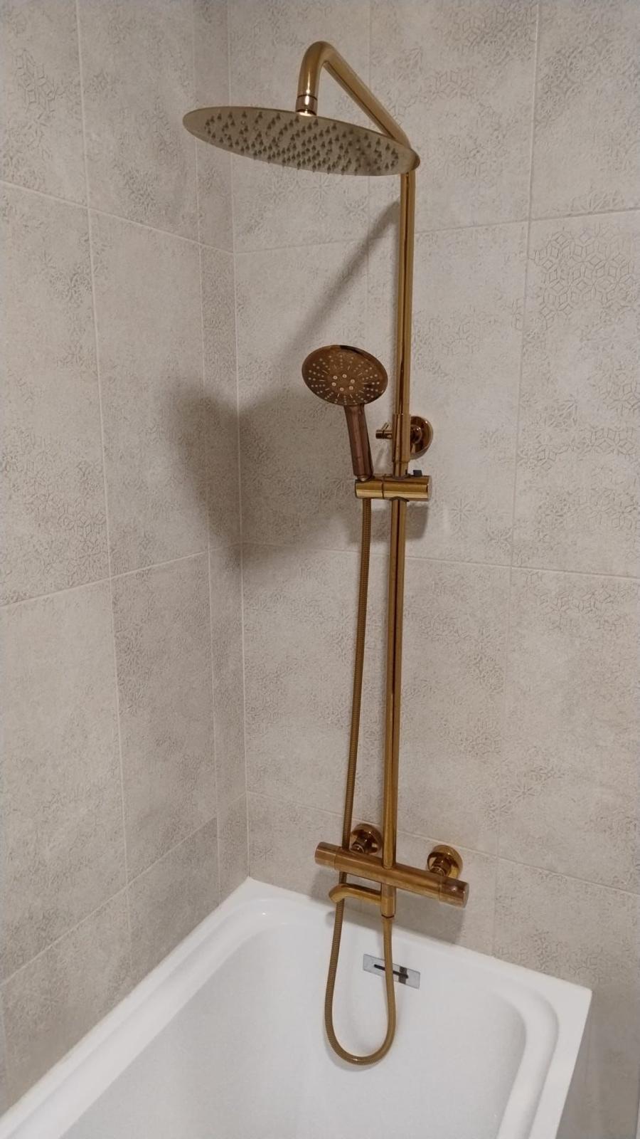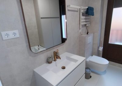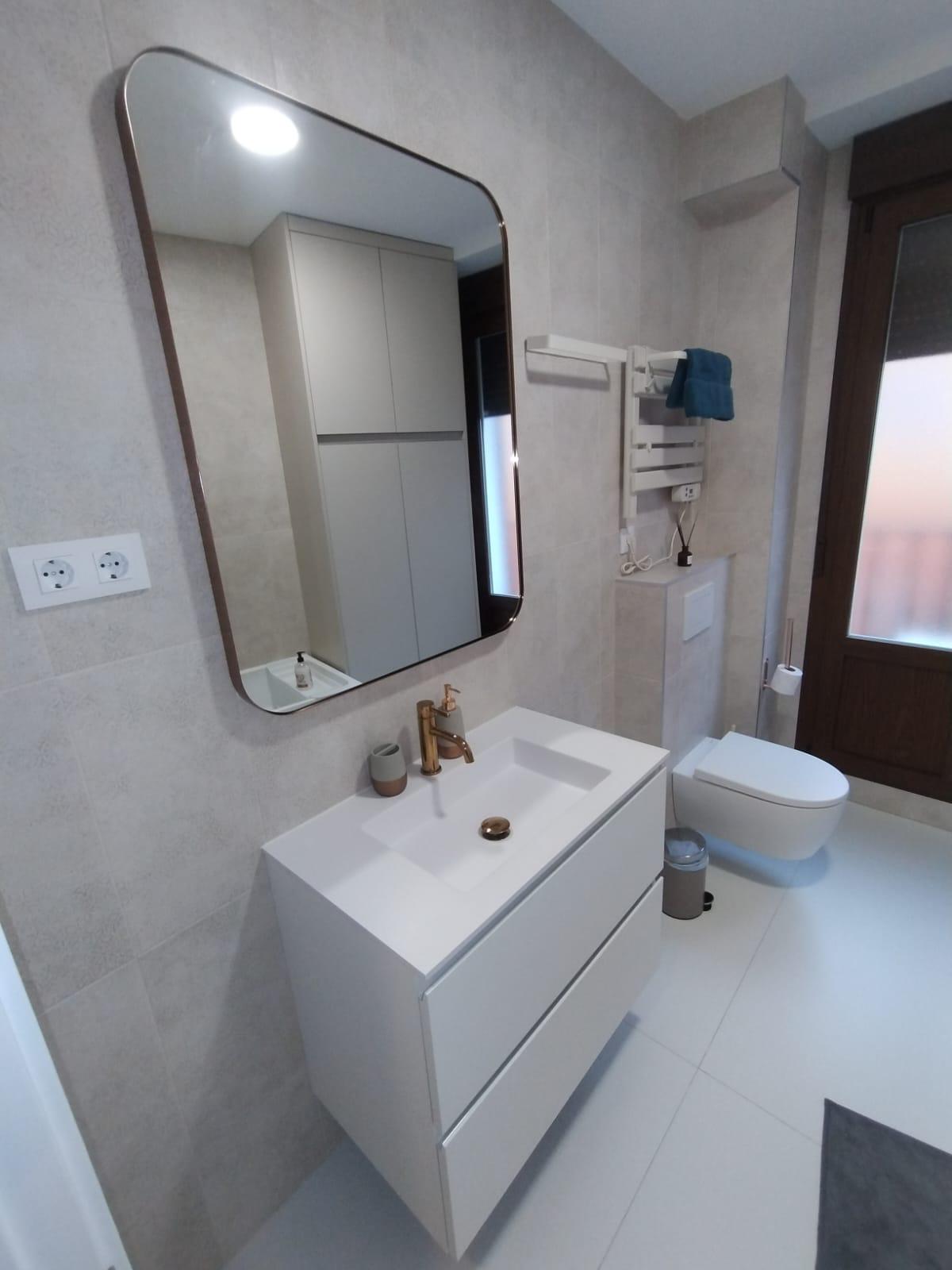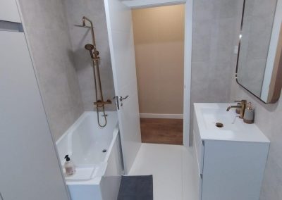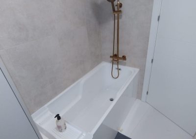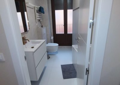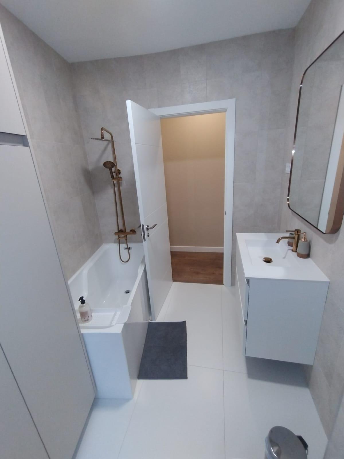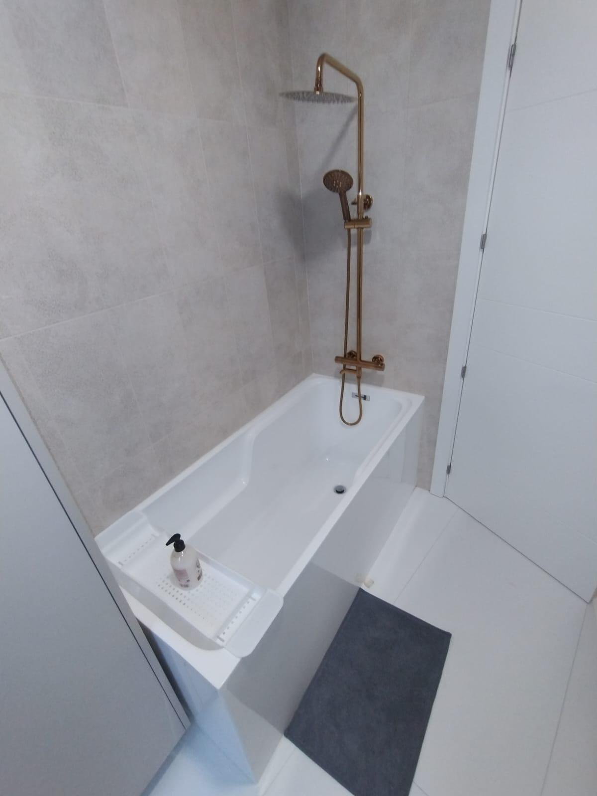 Un Baño de Hotel Boutique: A diferencia de la mayoría de apartamentos de centro, esta propiedad ofrece un baño elegante y espacioso equipado con acabados de alta calidad, que incluye tanto ducha como bañera con grifería premium. Es el rincón perfecto para desconectar y relajarse después de un día recorriendo la Gran Vía.